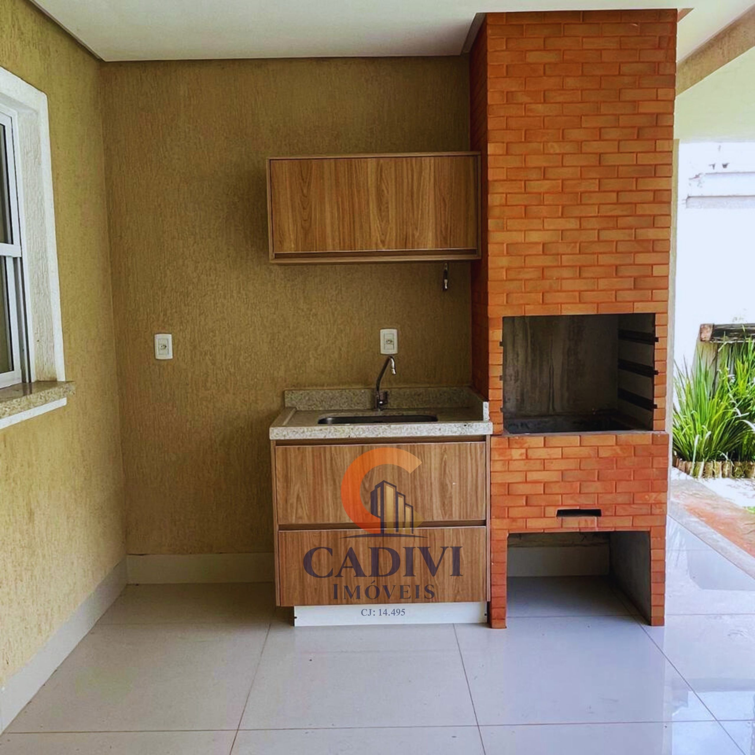 Varanda com churrasqueira, bancada de apoio e chuveiro